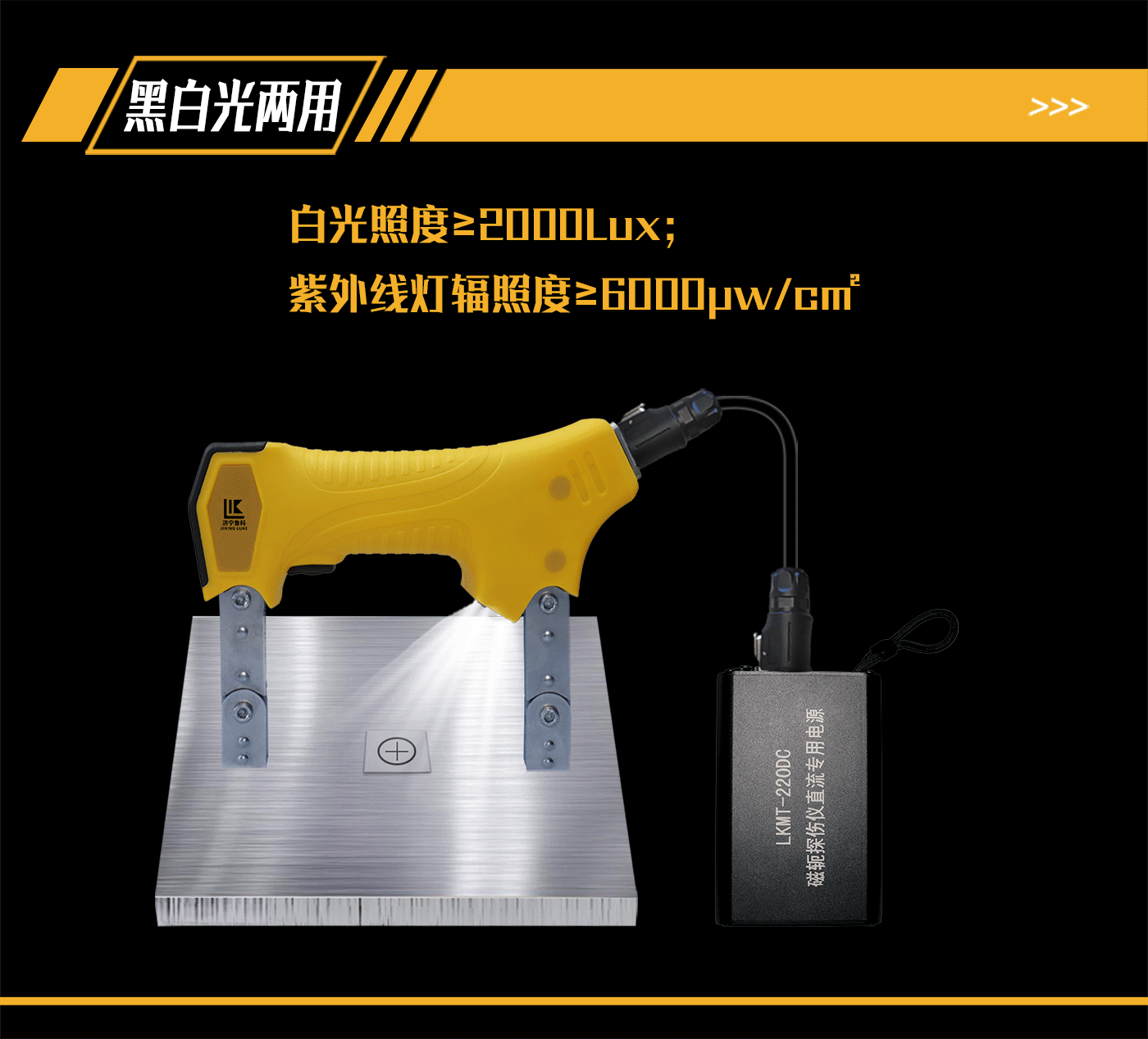 3、D型探頭具有紫外線、白光照明模式,采用按鍵切換;可以熒光磁粉探傷及普通磁粉探傷。