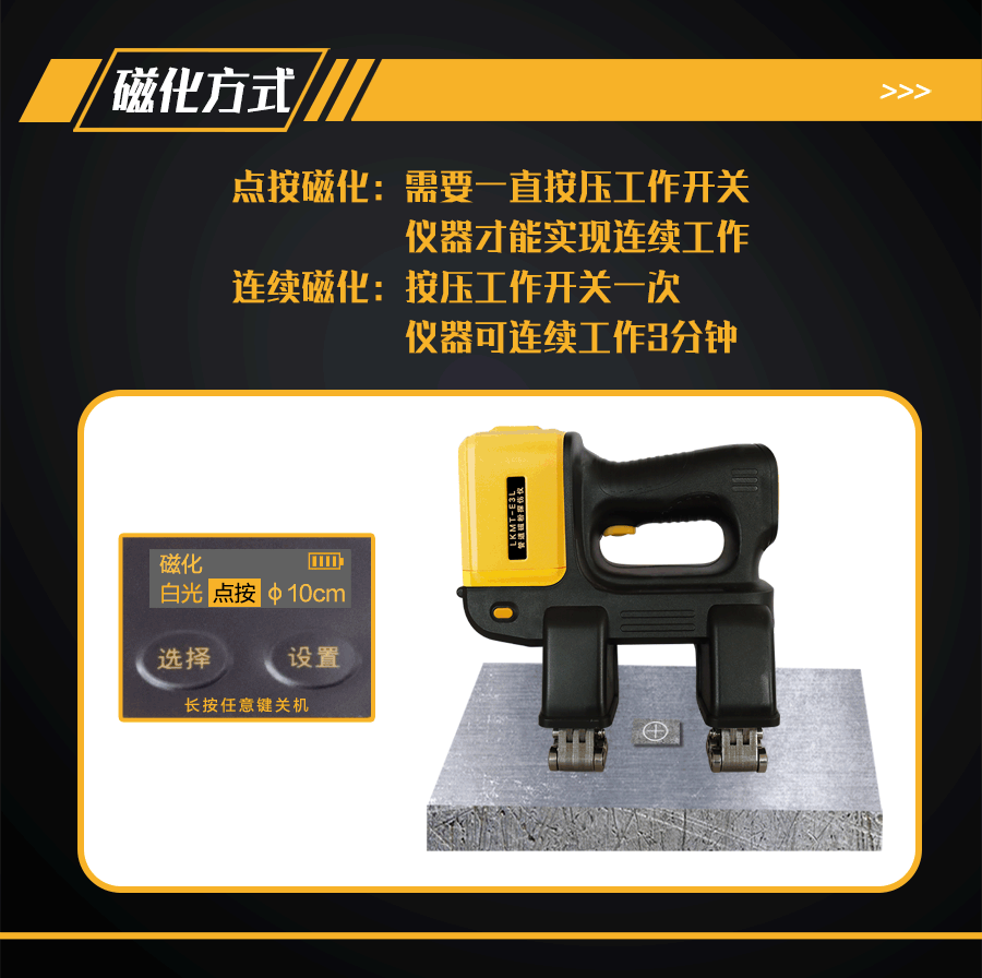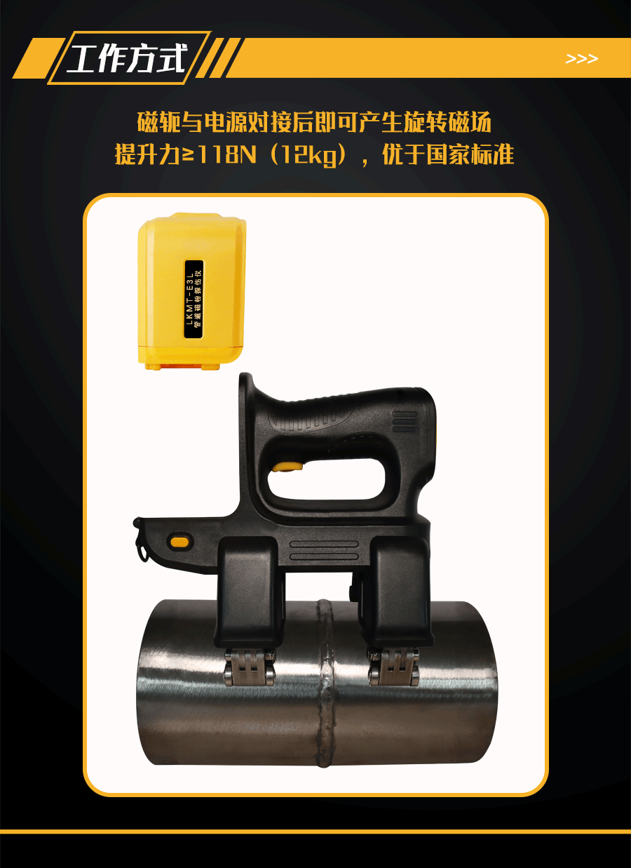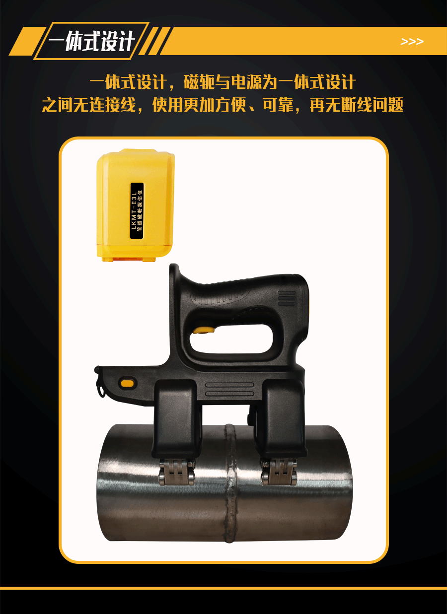 1、LKMT-E3L一體式旋轉(zhuǎn)磁場(chǎng)管道磁粉探傷儀,探頭與鋰電池一體式設(shè)計(jì),無(wú)需使用線鏈接;