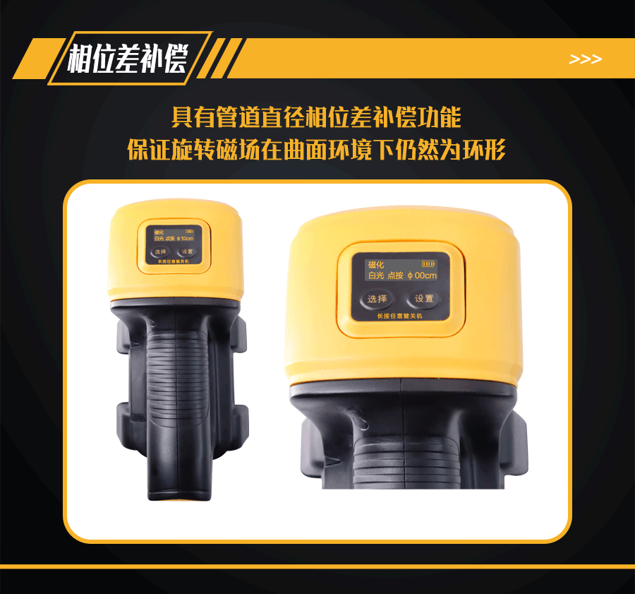 10、管道直徑相位差補(bǔ)償功能;檢測(cè)不同直徑管道,可在鋰電池電源OLED顯示屏上進(jìn)行直徑選擇,設(shè)置對(duì)應(yīng)管道直徑的相位差補(bǔ)償,保證旋轉(zhuǎn)磁場(chǎng)在曲面環(huán)境下仍然為環(huán)形;
