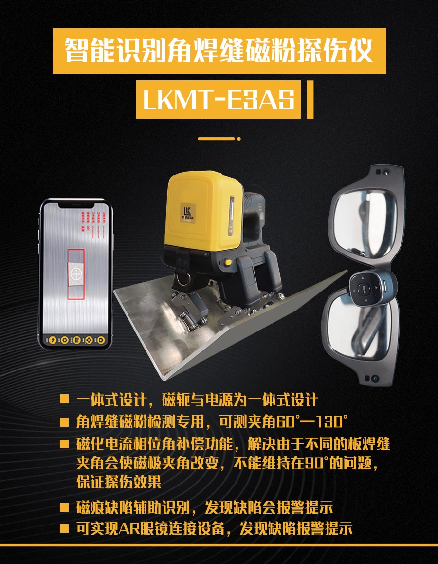 1、LKMT-E3AS一體式旋轉磁場角焊縫磁粉探傷儀,探頭與鋰電池一體式設計,無需使用線鏈接;